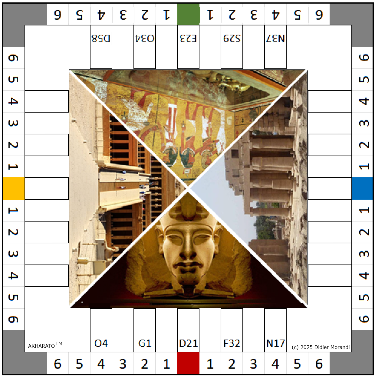AKHARATO est un jeu de société qui se joue de deux à quatre personnes, à partir de l’âge de sept ans. Les joueurs incarnent des Pharaons : Akhenaton (1371-1338 avant l’ère chrétienne), Hatchepsout (1508-1457 AEC) – seule femme Pharaon de l’histoire de l’Égypte antique -, Ramses II (1304-1213 AEC) et Toutânkhamon (1345-1327 AEC).